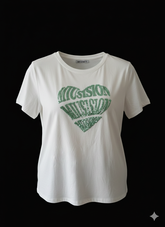 Damen T-Shirt in weiss Baumwollshirt Kurzarm mit Bärenmotiv in Grün
