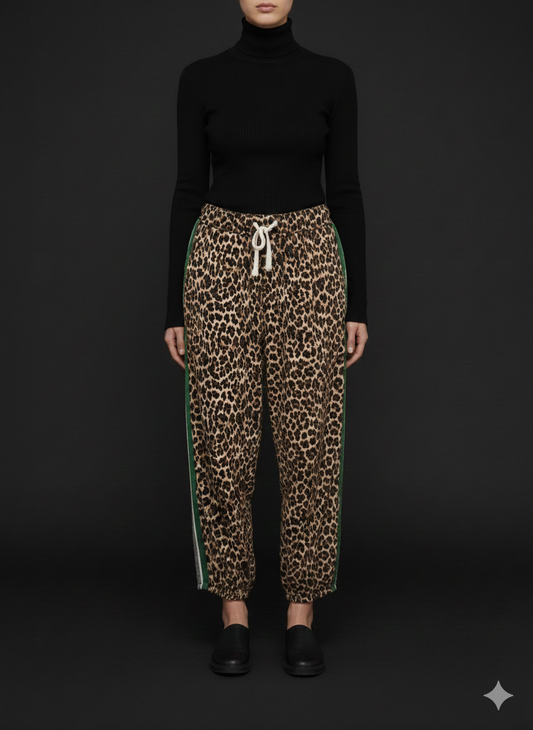 Damenstoffhose mit grünem Streifen weich fallend Leopardenoptik