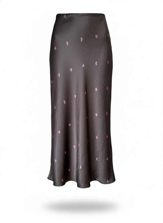 Donkerbruine satijnen rok met een subtiel hartjespatroon.
