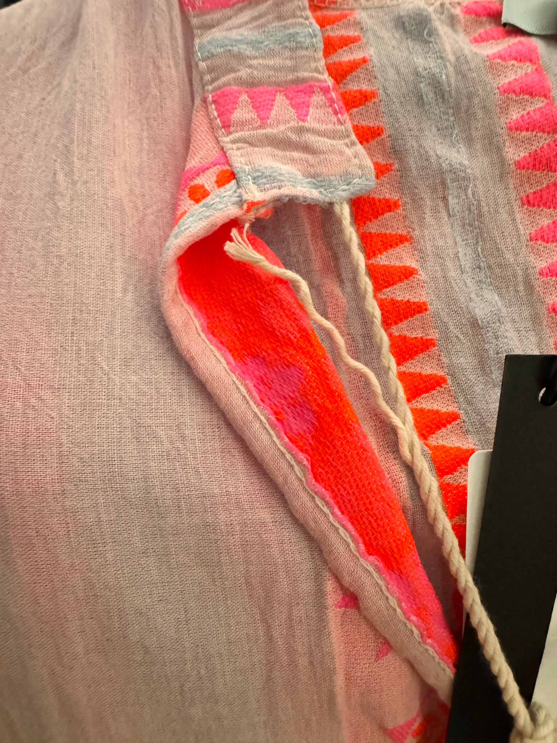 Deze speelse blouse van 100% katoen is een echte blikvanger! De lichte, luchtige stof zorgt voor comfort op warme dagen, terwijl het opvallende roze, oranje en rode borduurwerk op de delicate roze achtergrond een moderne boho-look creëert.