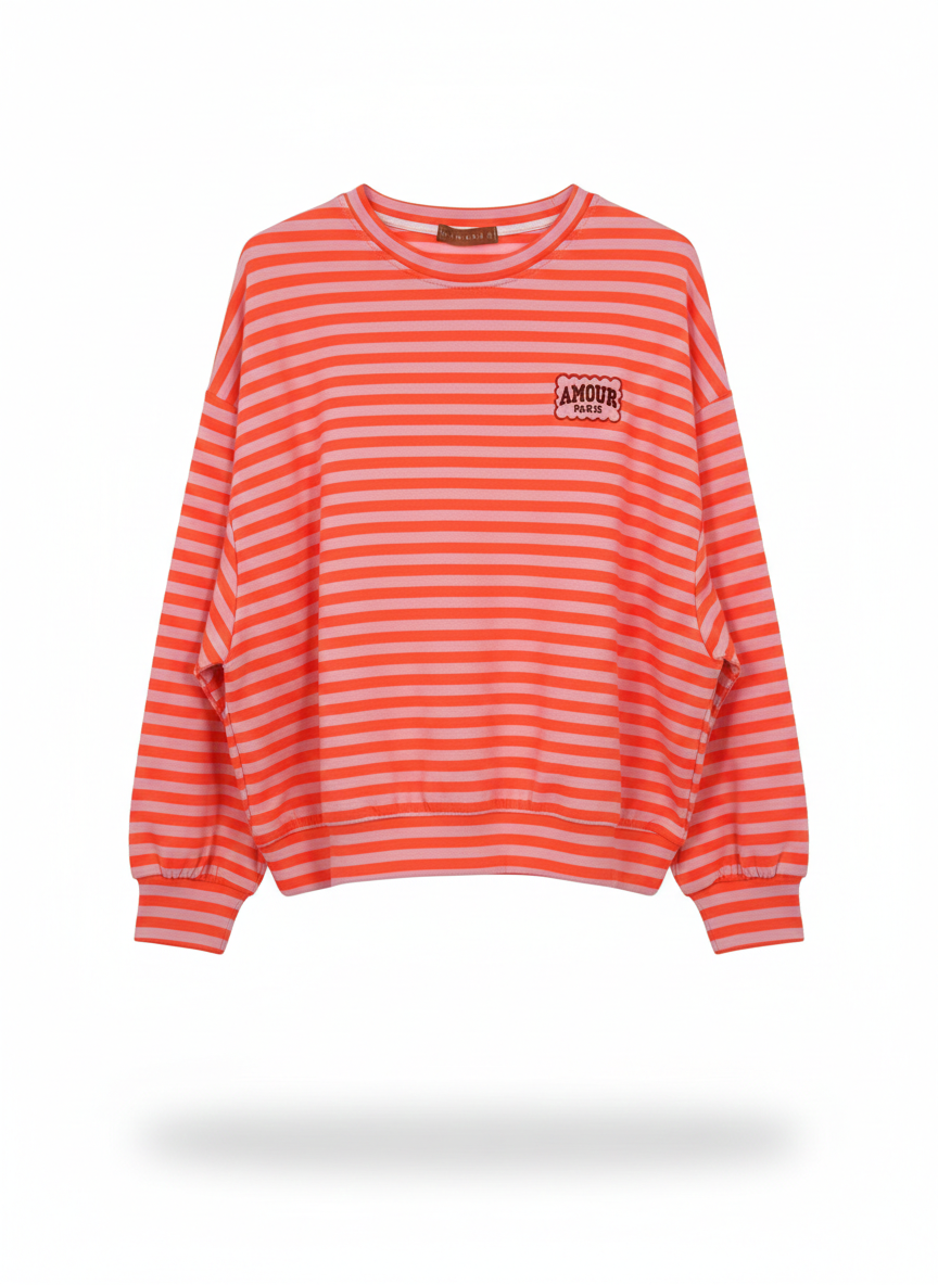 Deze stijlvolle trui heeft een klassiek streepdesign en comfortabele manchetten aan de mouwen en zoom. De relaxte pasvorm zorgt voor comfortabel dagelijks gebruik. Verkrijgbaar in neonoranje, paars of roze – perfect voor een frisse, moderne look. Materiaal: 80% katoen, 20% polyester