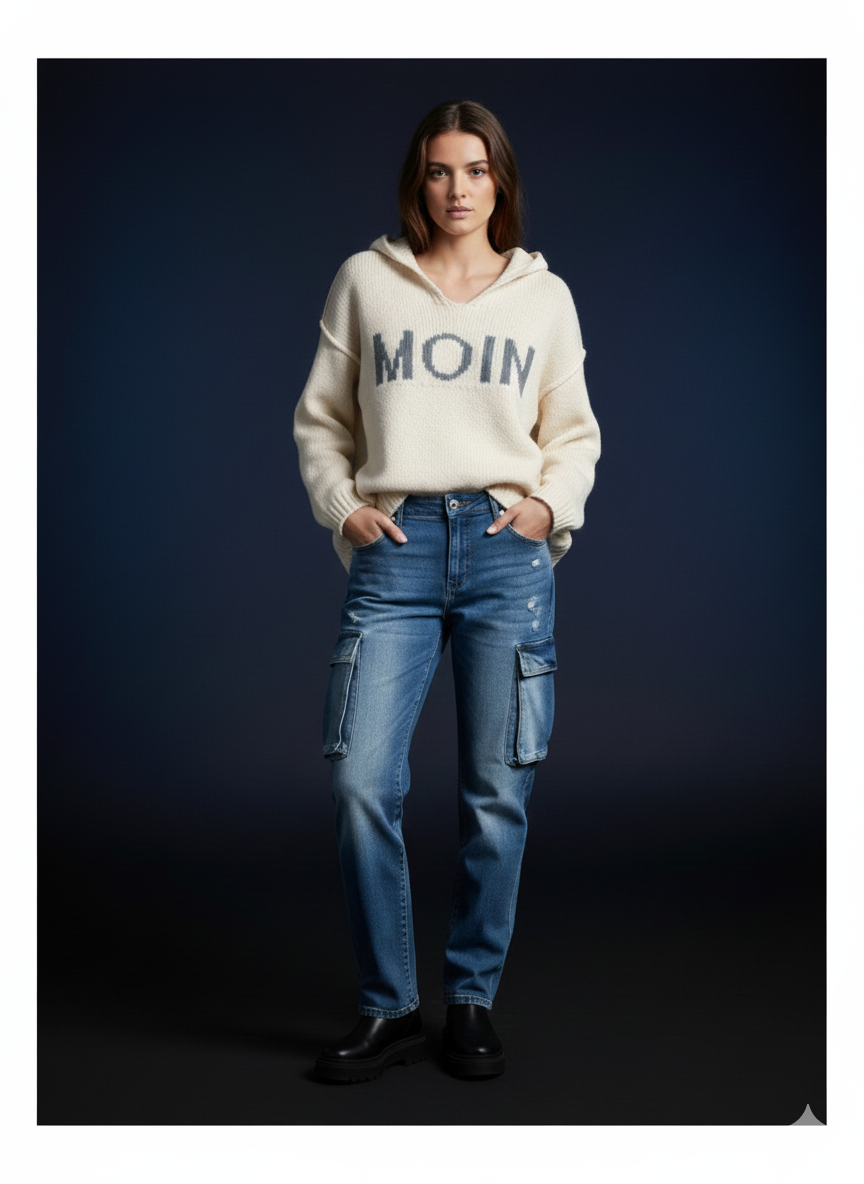 Stijlvolle oversized "MOIN" hoodie in een casual gebreid design – ideaal voor knusse dagen en trendy streetstyle looks. Zachte materialen, comfortabele pasvorm en capuchon voor een coole hoodie-look.