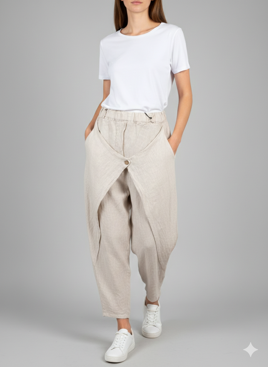 Deze uitzonderlijke broek, gemaakt van 100% linnen, combineert comfort met een vleugje extravagantie. De losse, ballonachtige snit zorgt voor maximale bewegingsvrijheid en een uniek silhouet. Het verfijnde overslagdesign met decoratieve knoop maakt deze broek tot een echte blikvanger – ideaal voor modebewuste vrouwen die iets bijzonders waarderen.