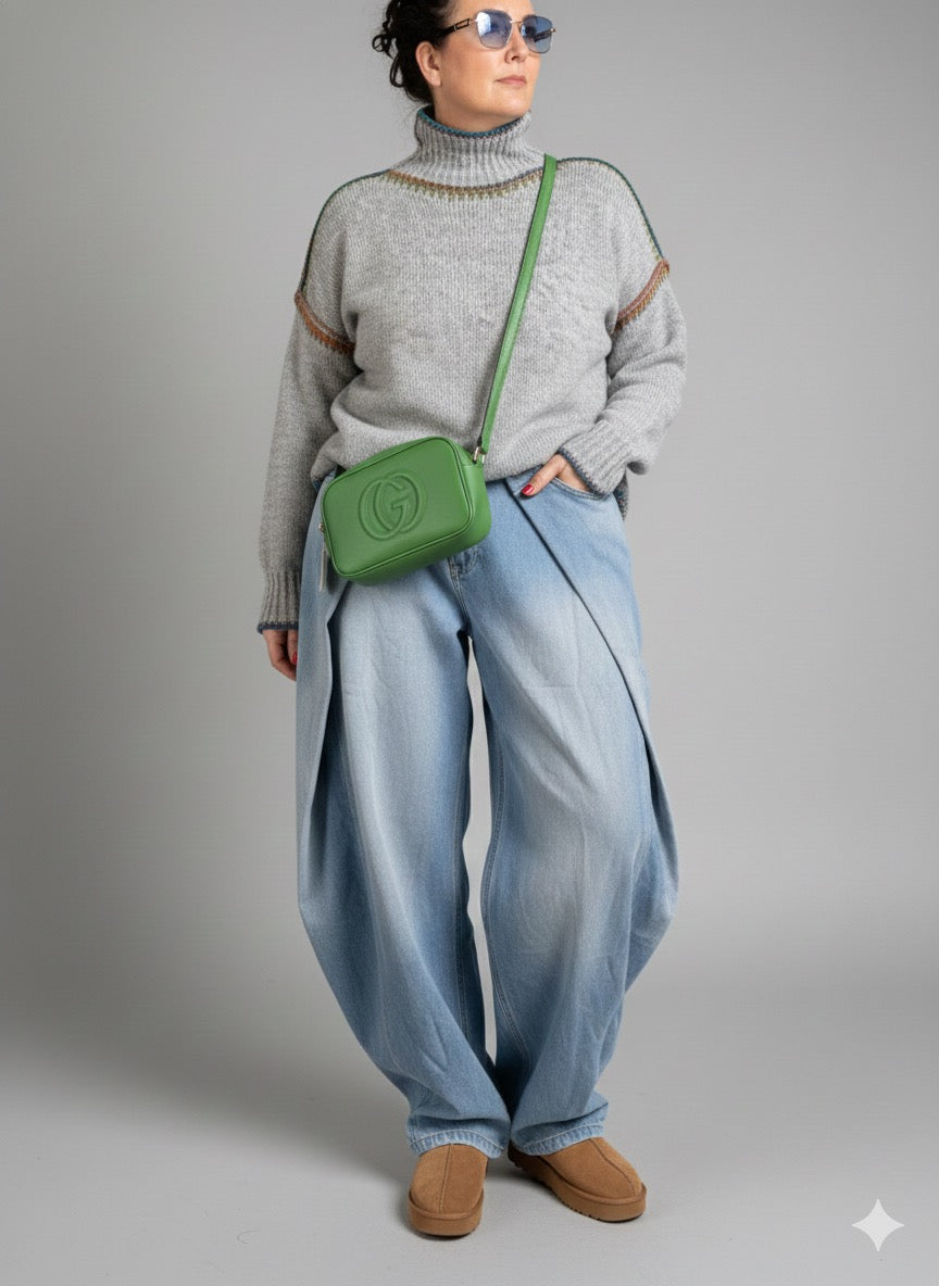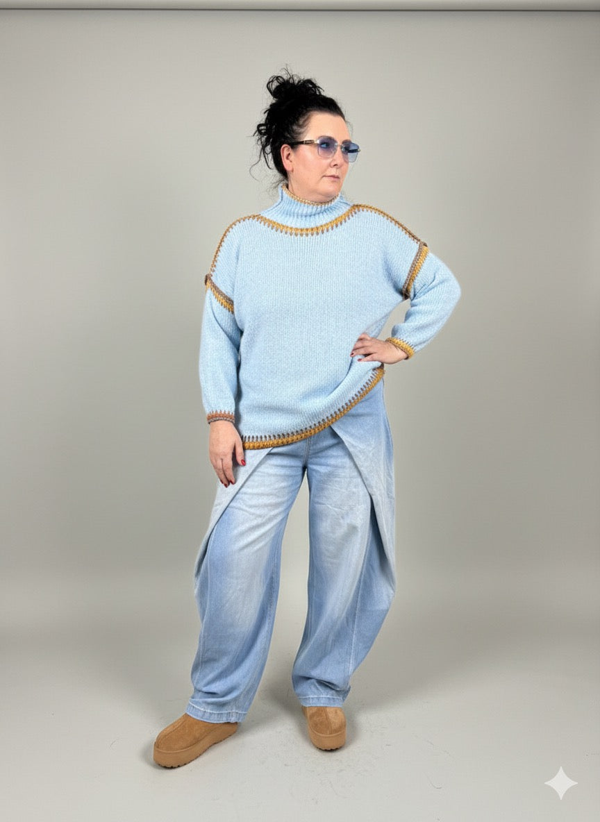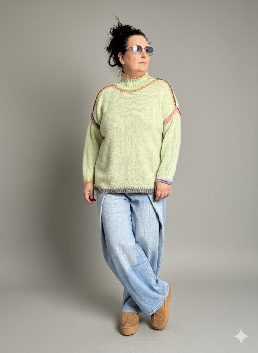 Comfortabele trui in appelgroen, donkerblauw, lichtblauw en grijs. Geschikt voor maat 40-46. Met opstaande kraag.
