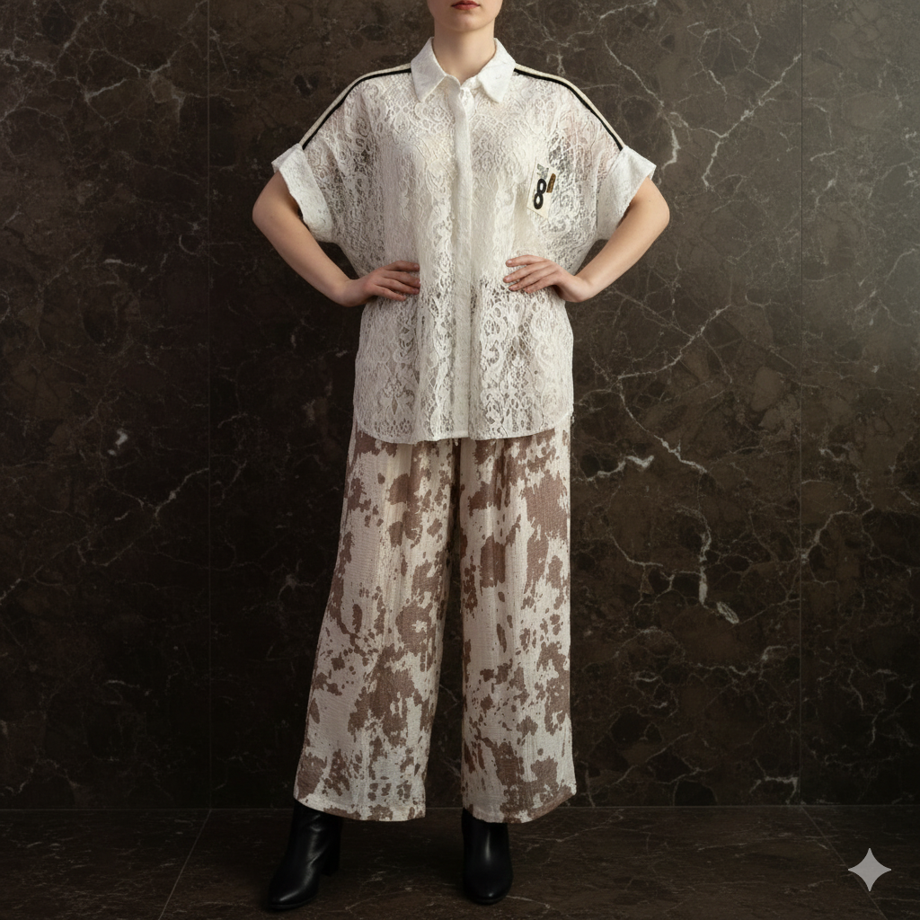 Damesbroek met wijde pijpen en print in beige – zacht en soepel vallend
