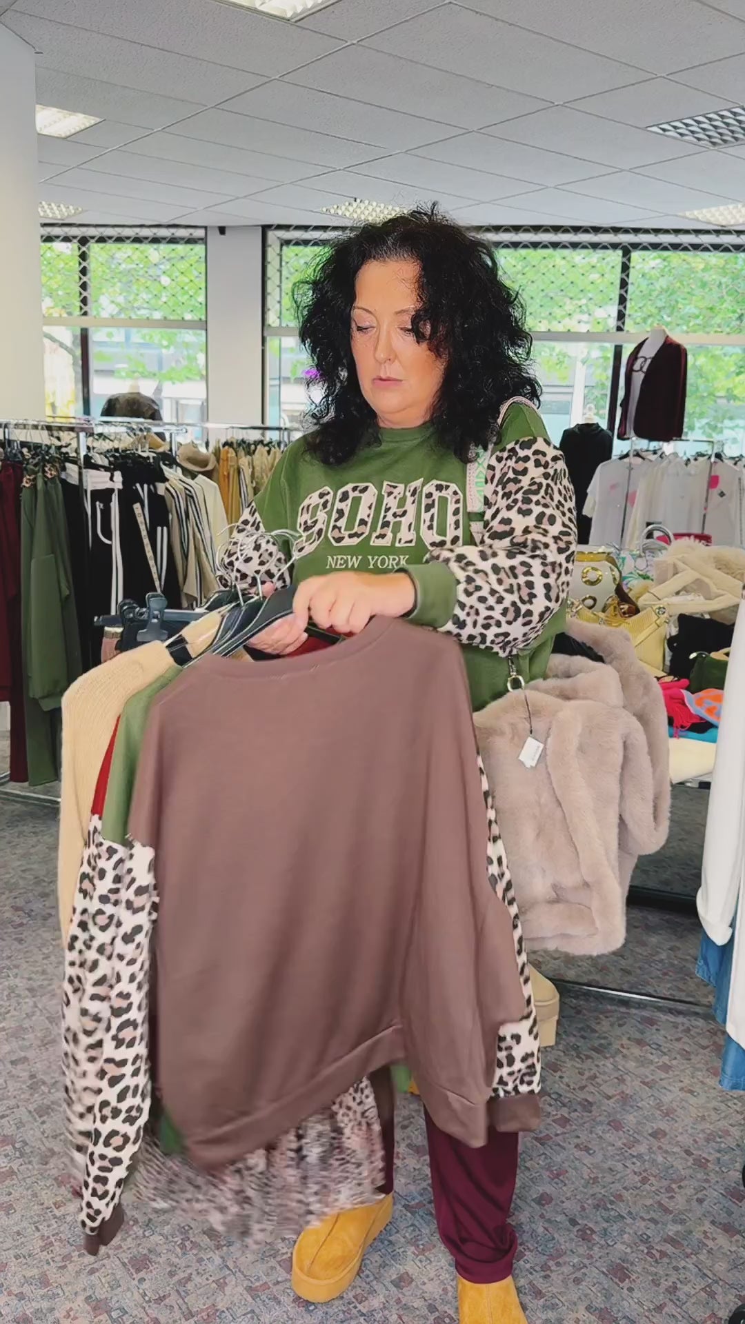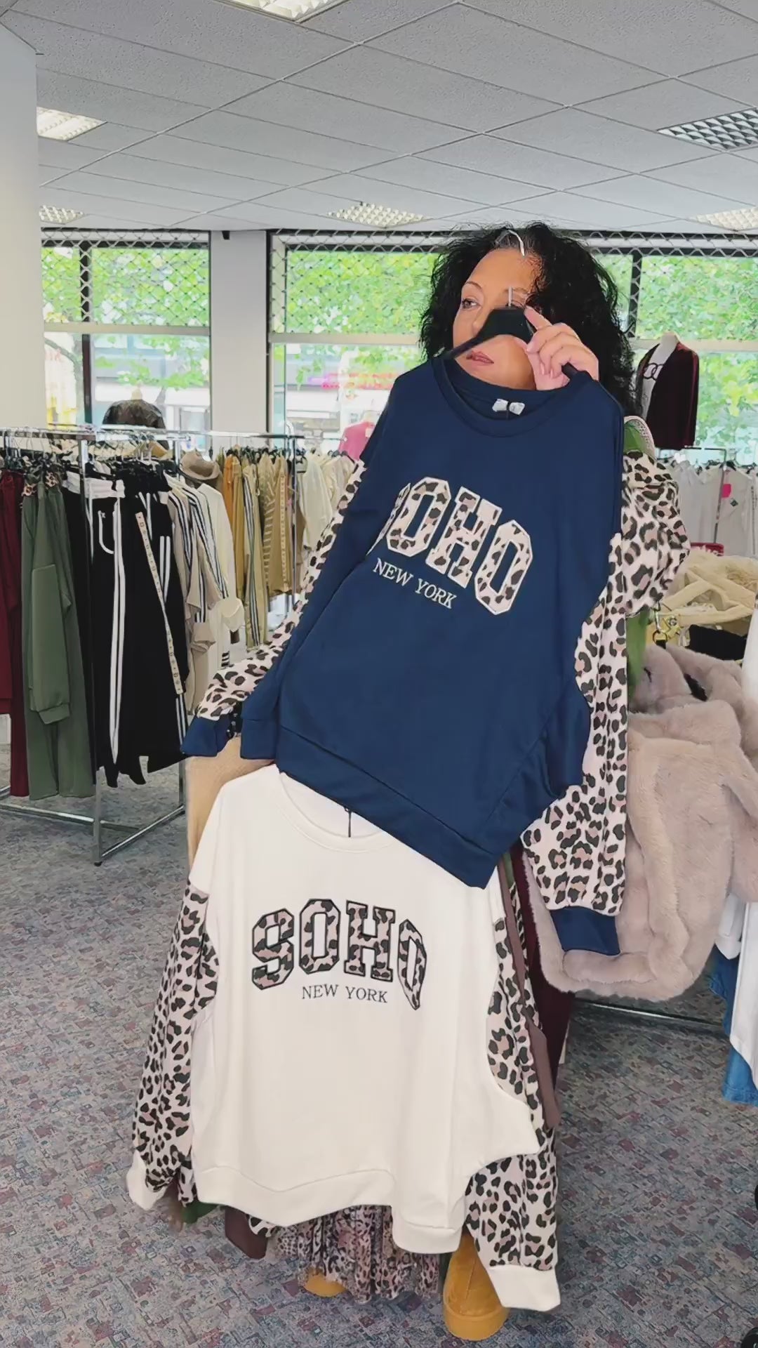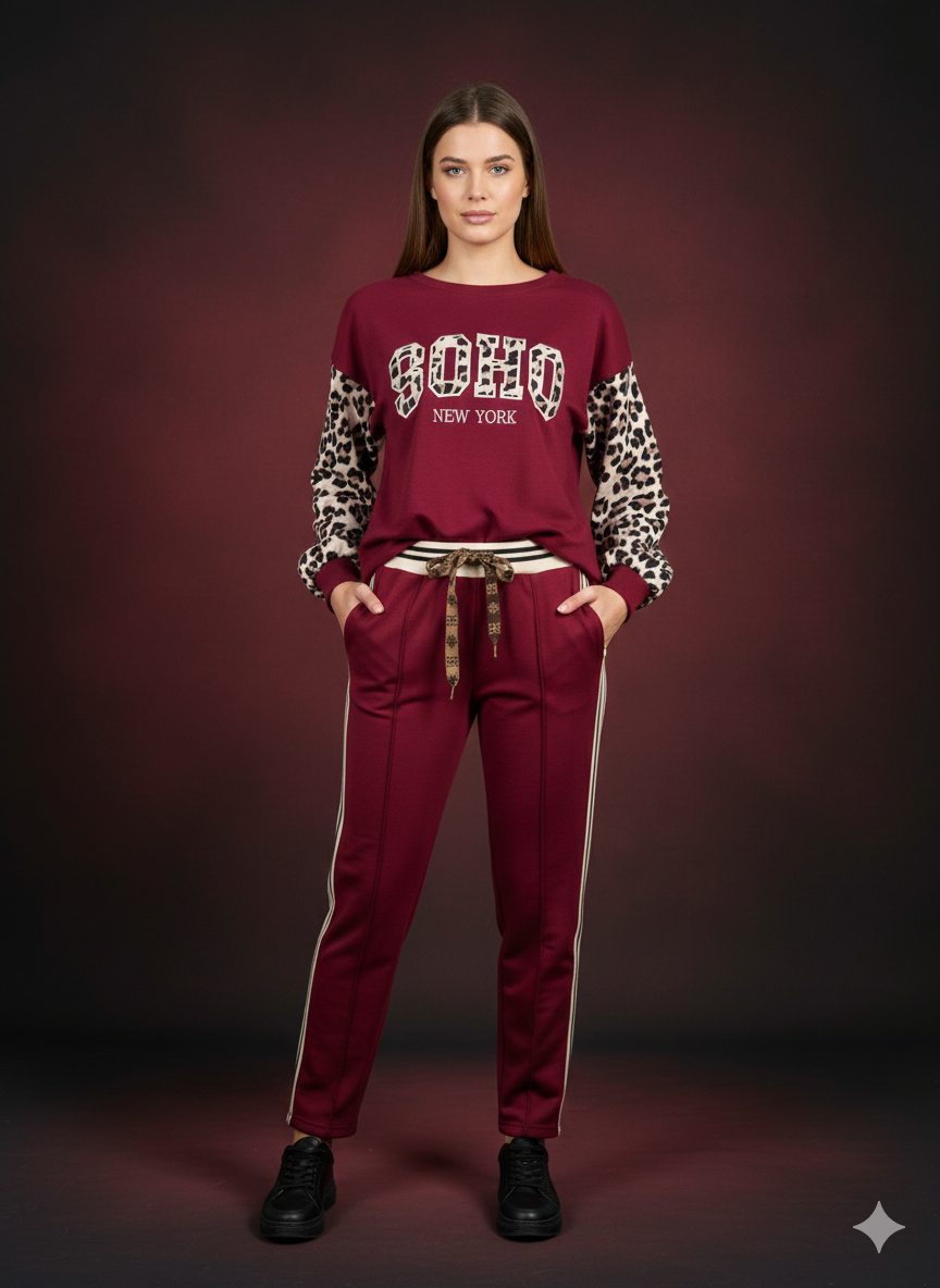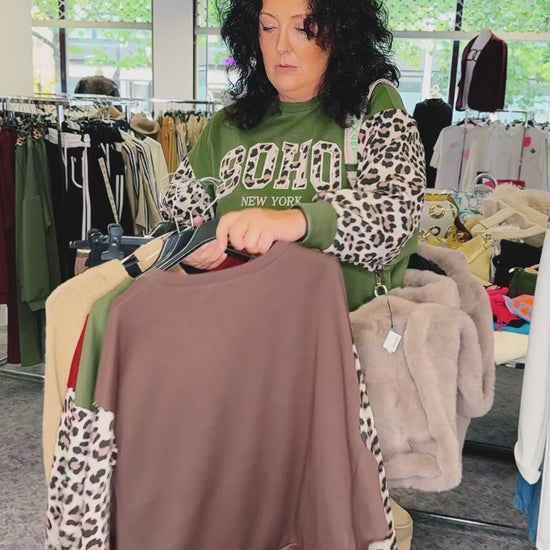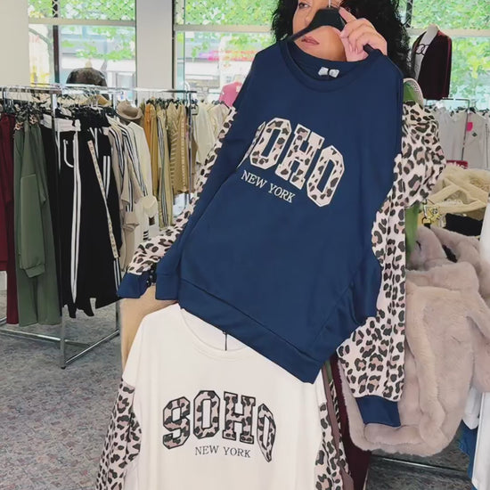 Deze trendy, getailleerde sweater combineert een urban streetstyle met een vleugje elegantie dankzij de dierenprint. De opvallende "SOHO NEW YORK" print op de voorkant en de mouwen met luipaardprint maken het een echt mode-statement – perfect voor vrouwen die zowel van stijl als comfort houden.