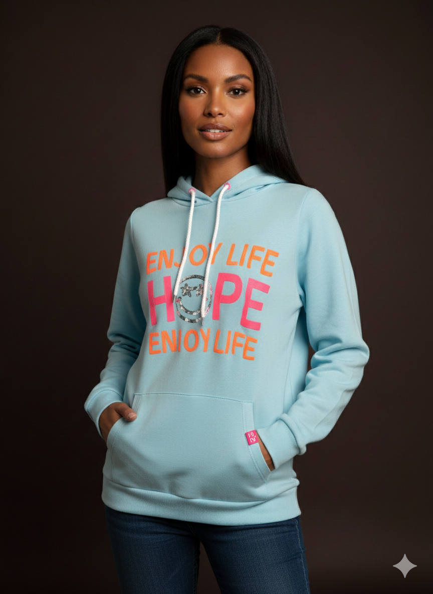 Een vrolijk en fris sweatshirt van Zwillingsherz met een kleurrijke "ENJOY LIFE – HOPE" slogan en een sprankelend smileygezichtje. Superzacht, comfortabel en perfect om je humeur elke dag op te fleuren.