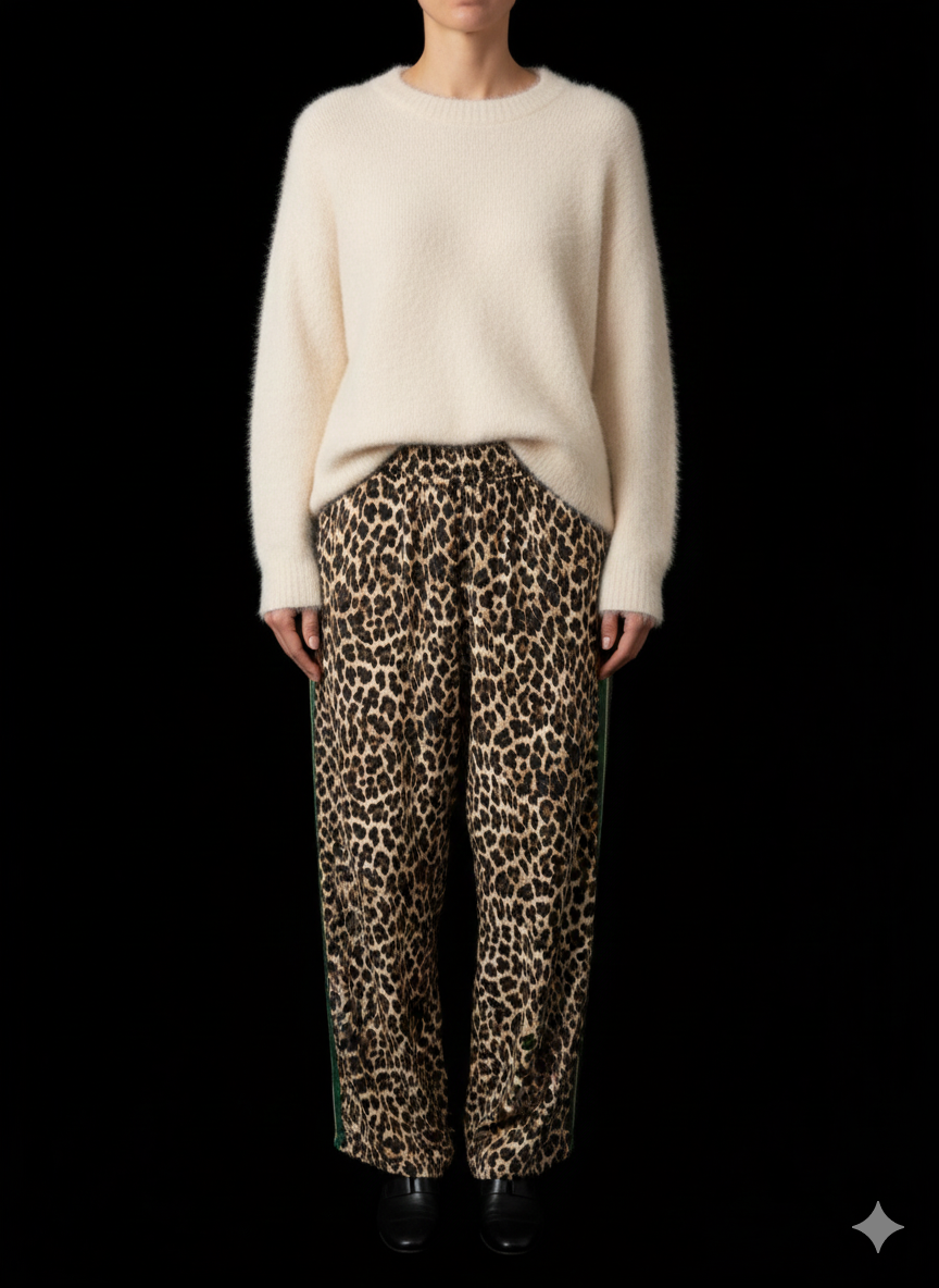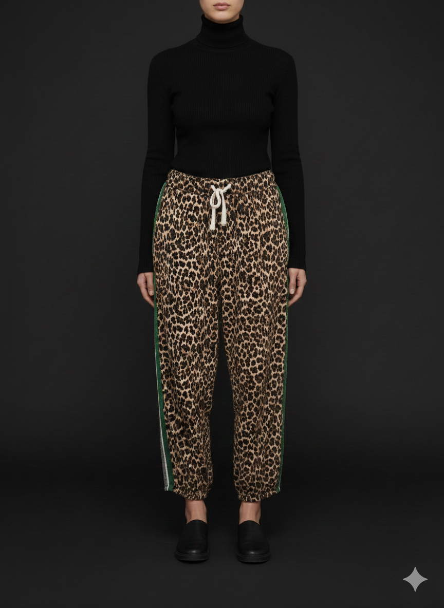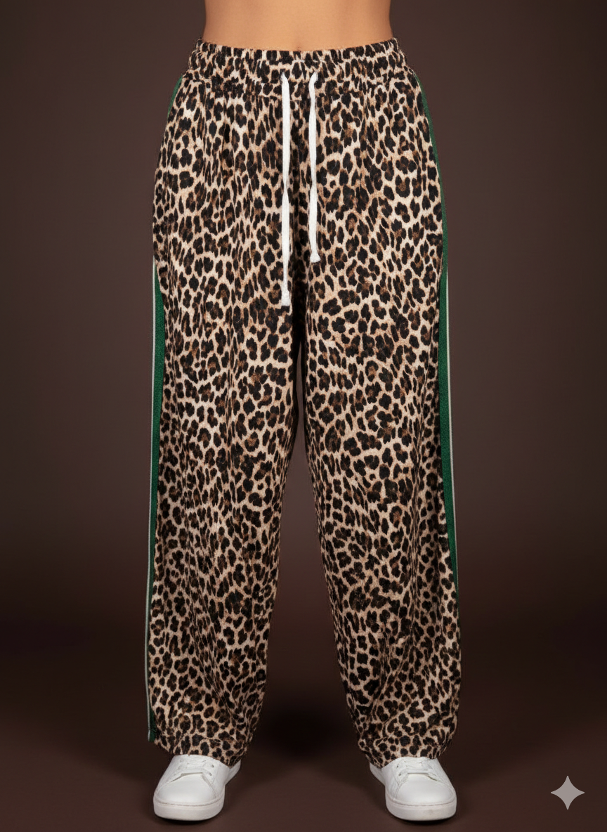 Damenstoffhose mit grünem Streifen weich fallend Leopardenoptik
