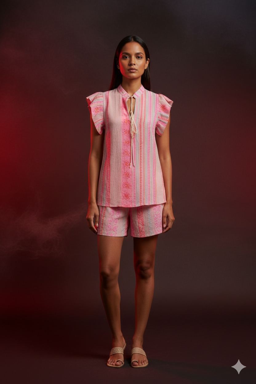 Die Bluse ist locker geschnitten und passt ideal für die Größen 38 bis 42. Mit kurzen, leicht gerafften Ärmeln, einer zarten Bindekordel am Ausschnitt und liebevollen Details ist sie perfekt kombinierbar – ob mit Jeans, Shorts oder Rock.