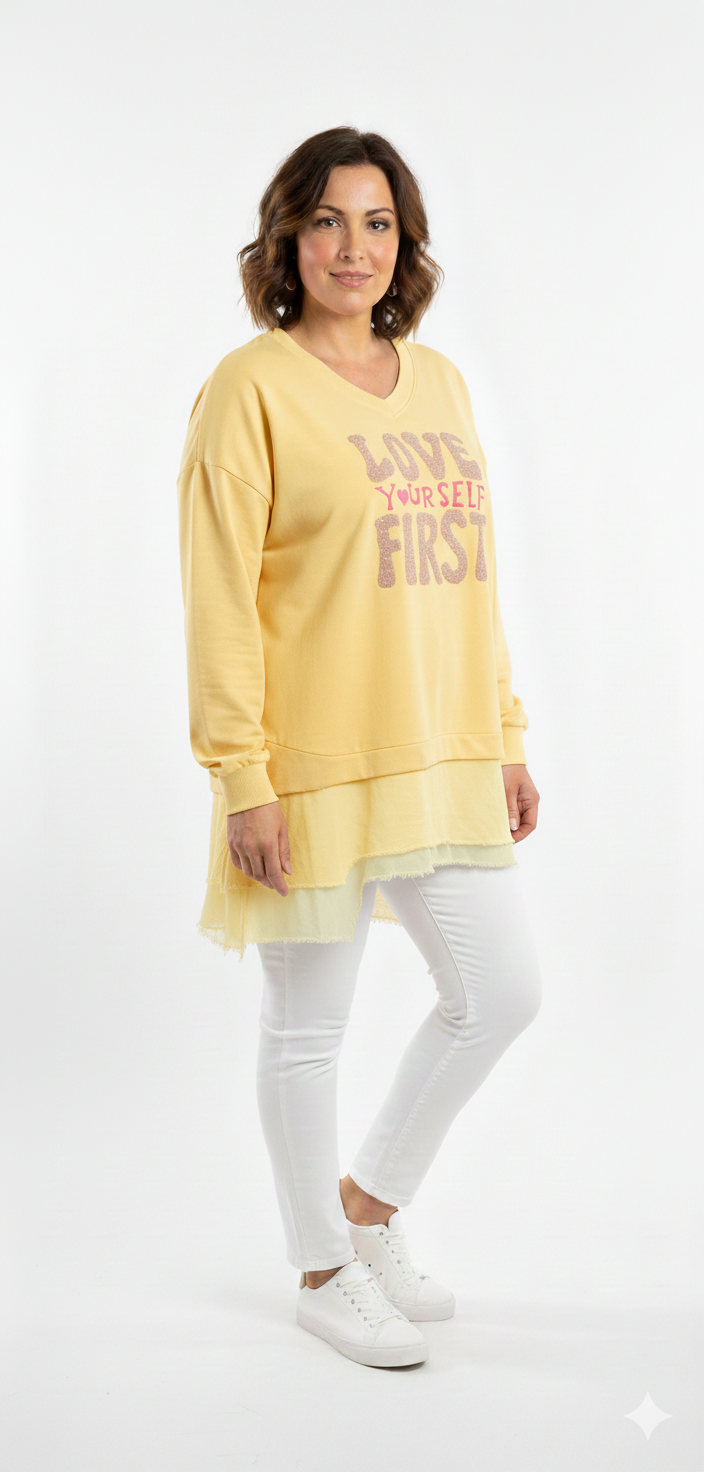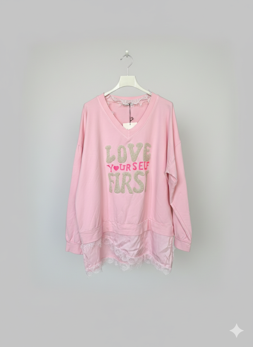 Dieses oversized Sweatshirt überzeugt mit einer besonderen Hemdverlängerung aus Spitze, die asymmetrisch unter dem Saum hervortritt und dem Look eine elegante Note verleiht. Der kastige Schnitt sorgt für eine lässige Passform, während der V-Ausschnitt mit Spitze das Design stilvoll abrundet. Der dezente „Love yourself first“-Print setzt ein positives Statement und macht das Sweatshirt zu einem echten Hingucker. Dank der lockeren Form trägt es sich angenehm bequem und passt auch ideal bei größeren Größen. Tragbar bis max Gr 44.
