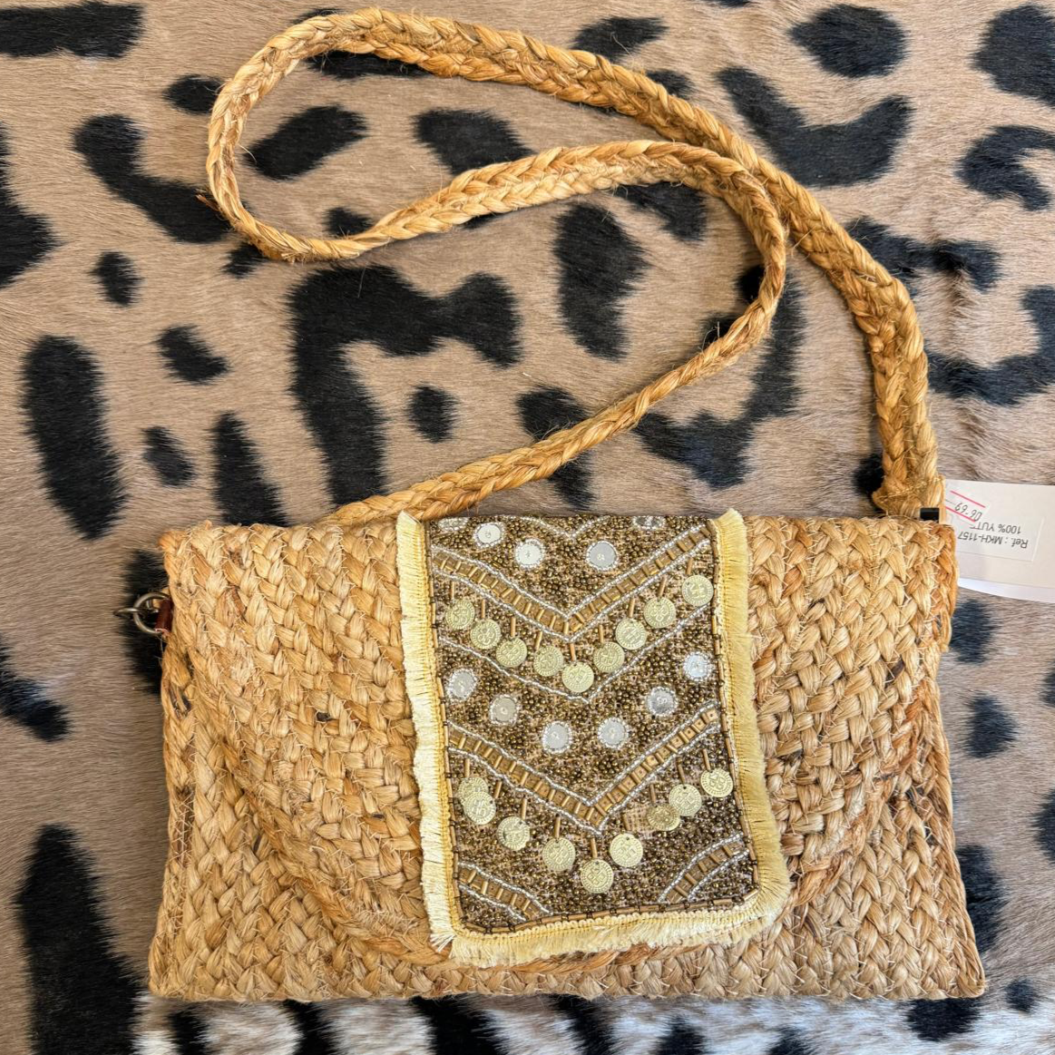 - Design: Eine Frontklappe, die mit kunstvollen Gold- und Silberfäden bestickt und mit funkelnden Pailletten verziert ist, verleiht dieser Tasche einen Hauch von Luxus. Umrandet von einer goldenen Einfassung, die das Gesamtbild abrundet.