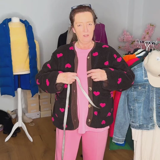 Ein echter Hingucker in tiefem Schokoladenton mit pinken Herzchen! Die Jacke hat eine durchgehende Knopfleiste, eingefasst mit dunkelbraunem Cord, und zwei praktische Eingriffstaschen vorne.