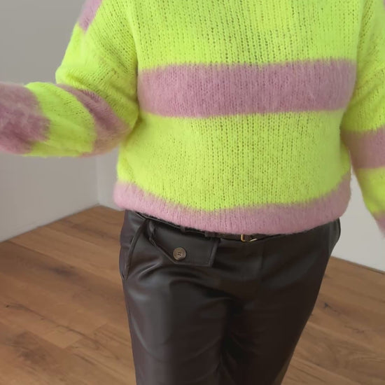 Weicher Strickpullover mit breiten Blockstreifen in Rosa und Neongelb. Super angenehm auf der Haut und perfekt für die kühleren Tage.