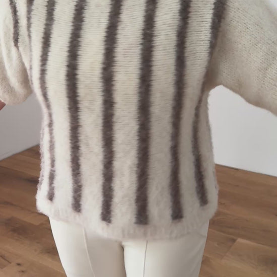Locker, weich und herrlich bequem – dieser weit geschnittene Strickpullover ist das perfekte Wohlfühlteil für die kühleren Tage. Die feinen, vertikalen Streifen in warmen Naturtönen strecken optisch und verleihen dem Look eine edle, moderne Note.