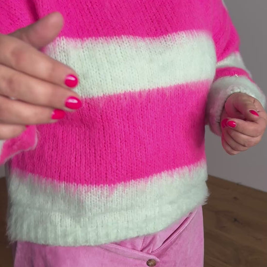Weicher Strickpullover mit breiten Blockstreifen in Mint und Neonpink. Super angenehm auf der Haut und perfekt für die kühleren Tage.