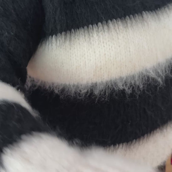Weicher Strickpullover mit breiten Blockstreifen in Schwarz und Beige. Super angenehm auf der Haut und perfekt für die kühleren Tage.