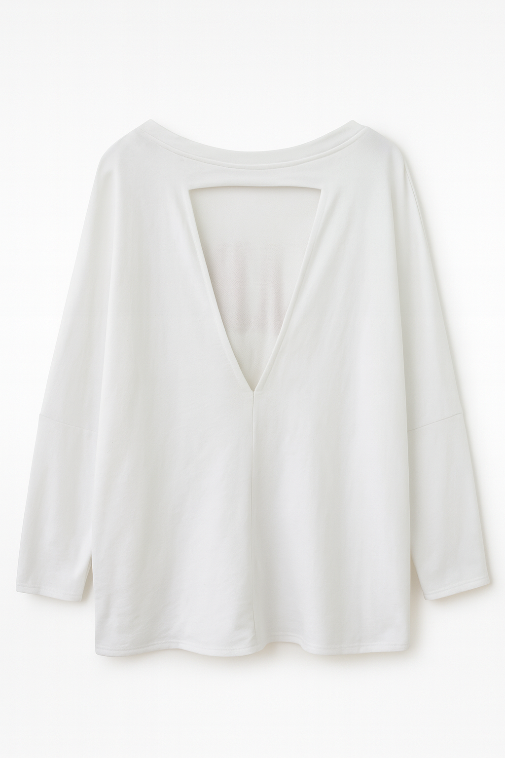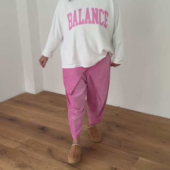 Weißes Sweatshirt mit pinkem BALANCE-Print vorne und tiefem V-Ausschnitt hinten – ein echter Hingucker!
