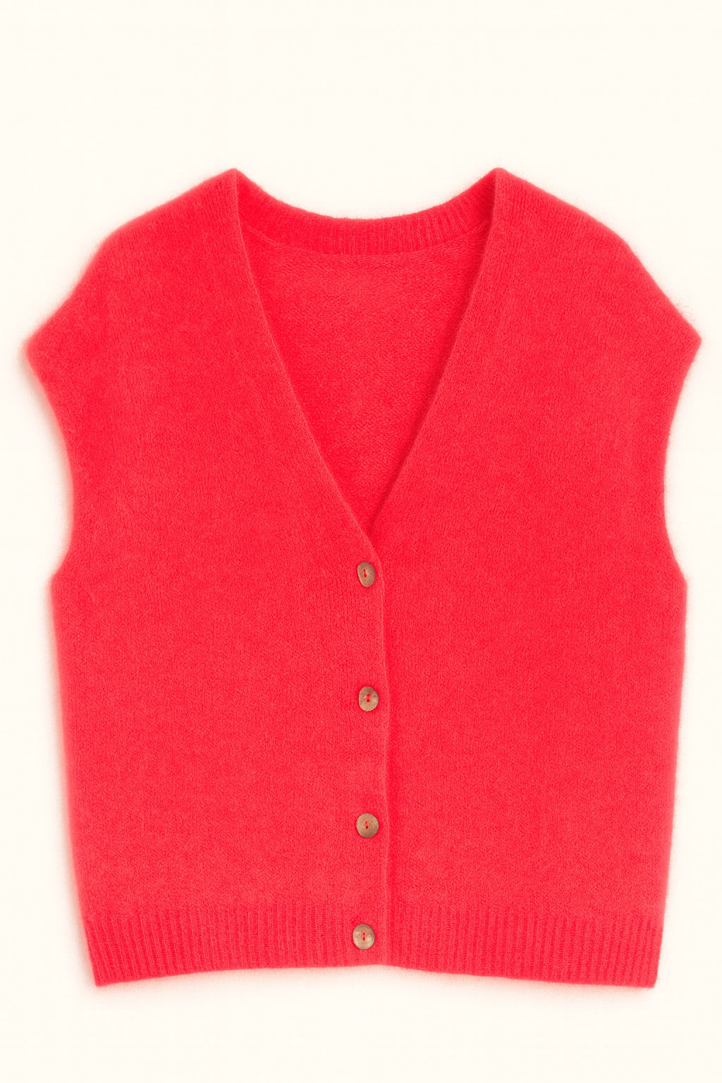Strahlender Polunder in Neon-Lachs mit tiefem V-Ausschnitt und dekorativer Knopfleiste. Weich, flauschig und in moderner kastiger Form. AA-Maß ca. 78 cm, dehnbar bis 108 cm, Länge hinten ca. 59 cm.