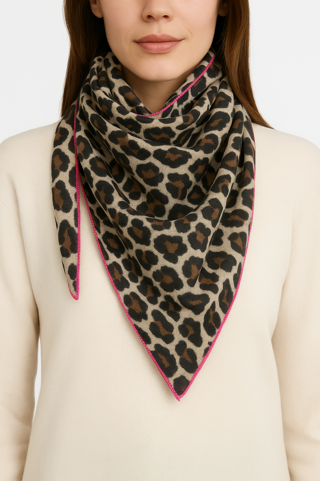 Dieses wunderschöne Dreieckstuch im angesagten Leo-Design ist ein echtes Fashion-Statement! Die Kombination aus Braun-, Schwarz- und Beigetönen wird durch den knallig pinken Rand perfekt abgerundet – ein Hauch von Eleganz trifft auf Trend.
