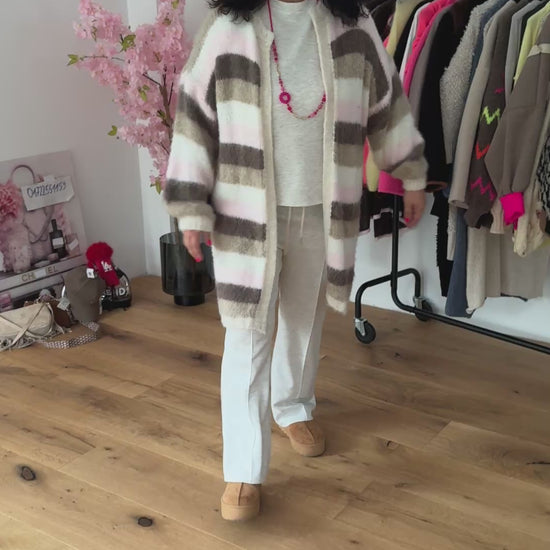 Dieser flauschige Strick-Cardigan ist ein absolutes Wohlfühlteil! Die zarten Streifen in Braun, Babyrosa und Weißverleihen ihm einen sanften, femininen Look – perfekt für kühle Tage oder gemütliche Abende.