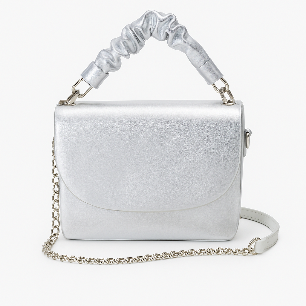 Das metallisch-glänzende Finish schimmert je nach Licht silber und leicht holografisch – einfach so pretty! Der gepolsterte Scrunchie-Tragegriff sieht nicht nur super fancy aus, sondern liegt auch voll bequem in der Hand. Und wenn du lieber freihändig unterwegs bist? Kein Problem! Mit dem silbernen Kettengurt mit weißem Kunstlederdetail kannst du sie easy crossbody tragen