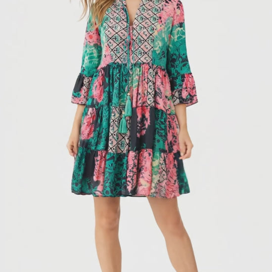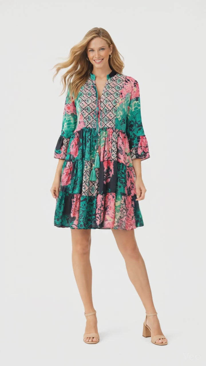 Dieses wunderschöne Boho Damenkleid vereint feminine Leichtigkeit mit einem auffälligen Ethno-Design in Pink, Grün und Schwarz. Der lockere Tunika-Schnitt sorgt für eine luftige Passform und macht das Kleid zum perfekten Begleiter für warme Tage, Urlaub oder entspannte City-Looks.