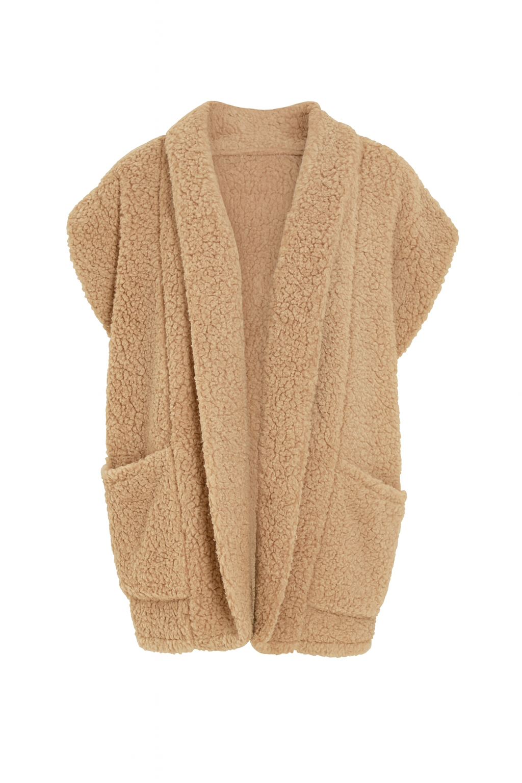 Weste in braun Teddyfell tragbar von 38-44, 30 % Lana Wolle und 70 % Poliester, 2 Eingrifftaschen von oben, Kragen/auch Stehkragen, nicht schließbar, kuschelig weich