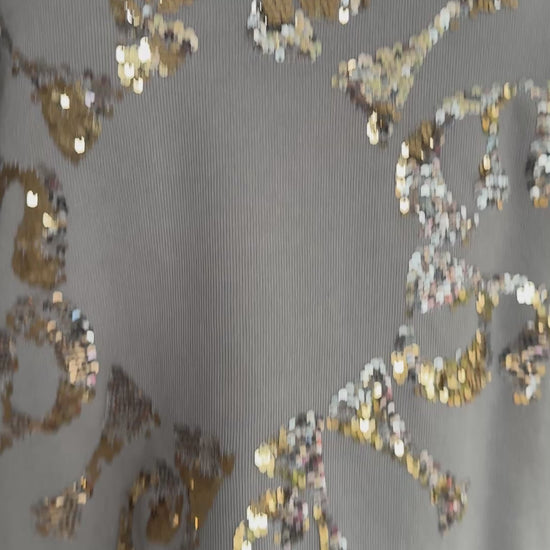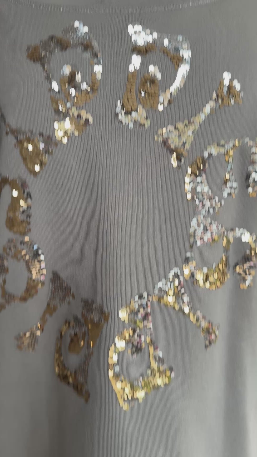 Das Highlight dieses Pullovers ist das kunstvoll eingearbeitete Muster aus gold- und silberfarbenen Pailletten im Brustbereich. Es setzt einen glamourösen Akzent auf dem schlichten, grauen Grundton und verleiht deinem Look eine edle Ausstrahlung – ohne dabei aufdringlich zu wirken.