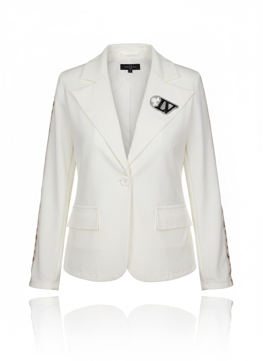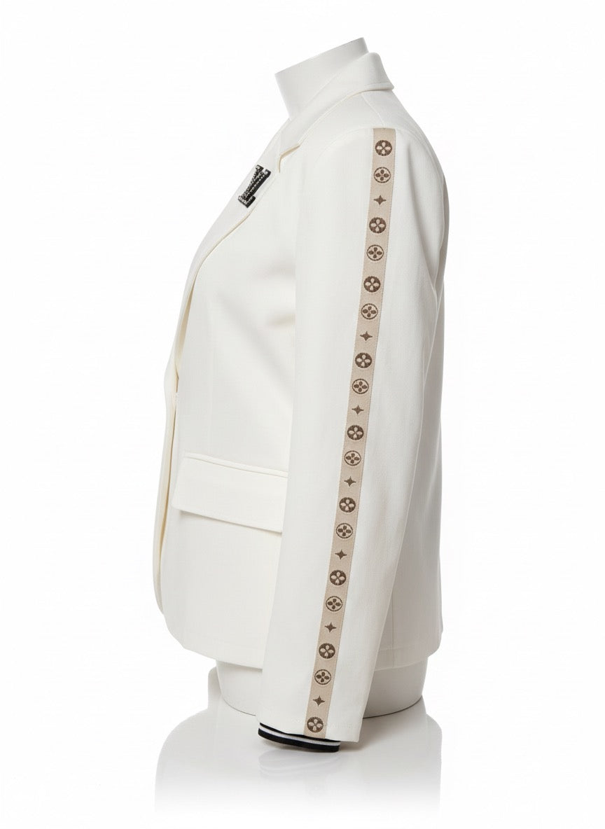 Dieser weiße Damen-Anzug ist die perfekte Kombination aus klassischem Business-Look und sportivem Streetwear-Style. Mit seinen schwarzen Streifendetails an Ärmeln und Hosenbeinen sowie dem edlen Blazer-Schnitt vereint er moderne Eleganz mit einem trendigen Athleisure-Touch.