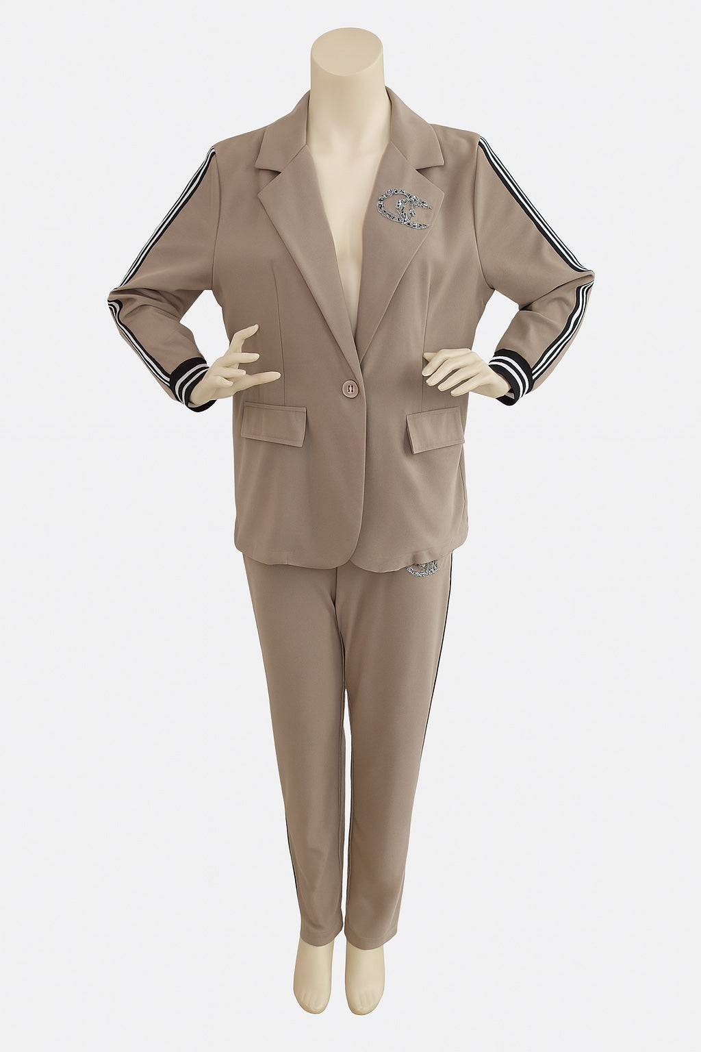 Dieser taupe Damen-Anzug ist die perfekte Kombination aus klassischem Business-Look und sportivem Streetwear-Style. Mit seinen schwarzen Streifendetails an Ärmeln und Hosenbeinen sowie dem edlen Blazer-Schnitt vereint er moderne Eleganz mit einem trendigen Athleisure-Touch.