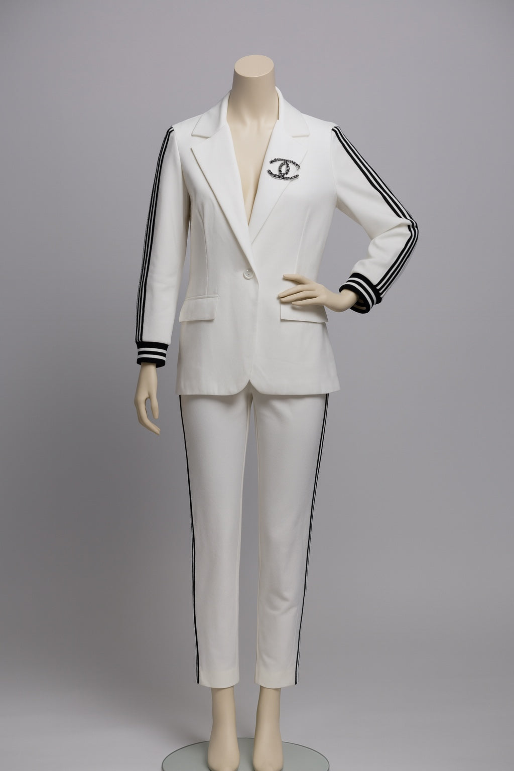 Dieser weiße Damen-Anzug ist die perfekte Kombination aus klassischem Business-Look und sportivem Streetwear-Style. Mit seinen schwarzen Streifendetails an Ärmeln und Hosenbeinen sowie dem edlen Blazer-Schnitt vereint er moderne Eleganz mit einem trendigen Athleisure-Touch.